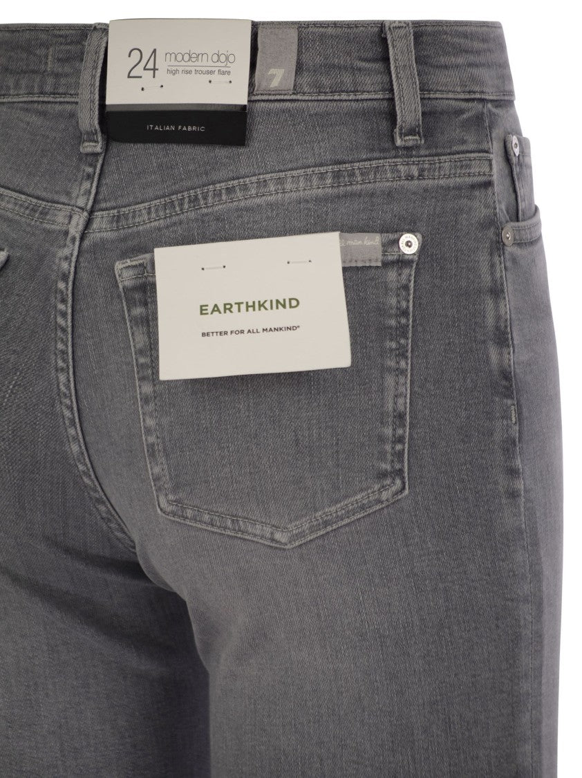 These high-waisted jeans from 7 For All Mankind draw inspiration from early 2000s fashion. They feature wide flared legs and a classic five-pocket design. Crafted from premium grey denim, the jeans showcase subtle shading and whiskering for a vintage aesthetic. The super stretch fabric provides exceptional comfort and a flattering fit, making them a versatile addition to any casual wardrobe. They pair effortlessly with a fitted white tee and tailored blazer for an elevated look.