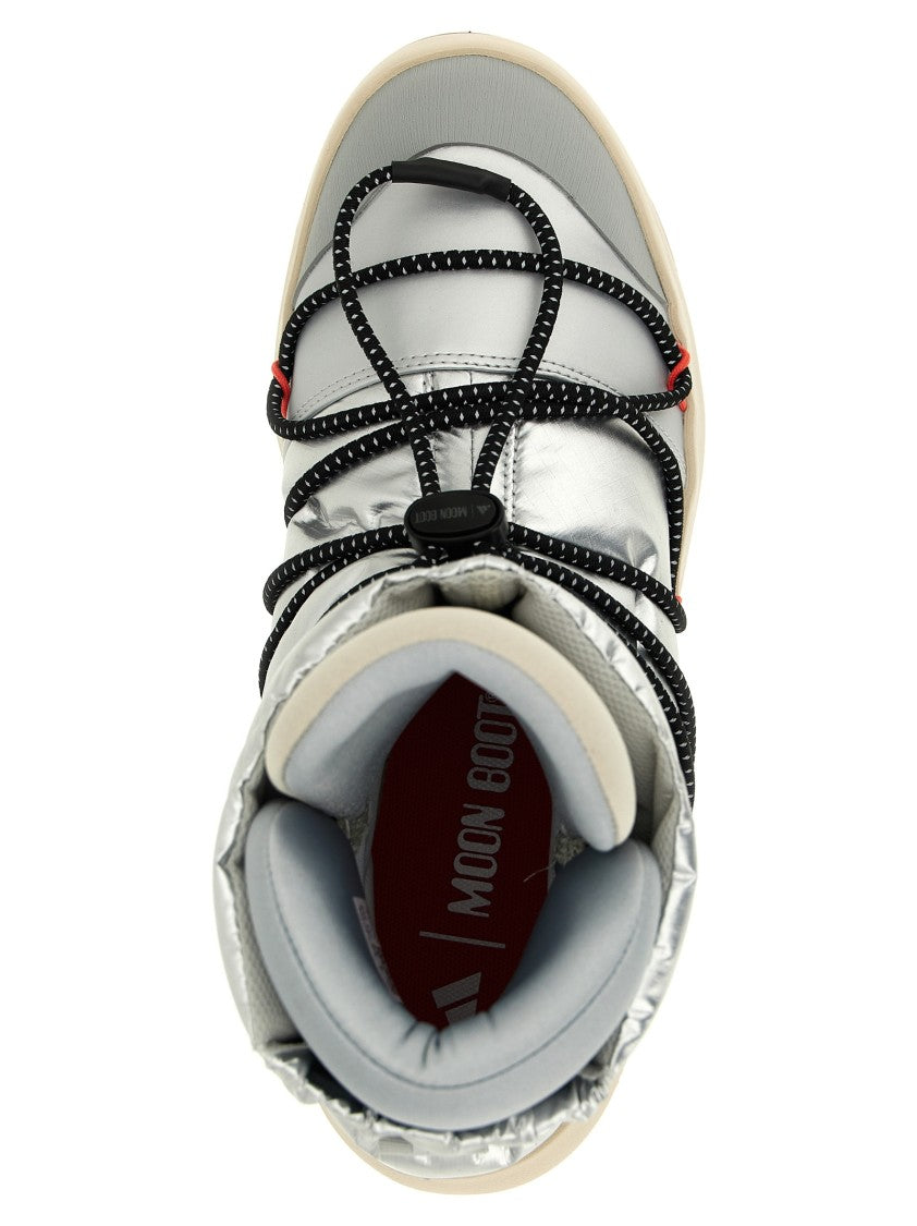 Adidas x Moonboot presents the 'Ace' ankle boots, showcasing an innovative blend of shiny metallic silver fabric and multi-layer synthetic materials. The futuristic design features a black Quicklace closure that ensures a secure fit and a cushioned beige midsole for optimal comfort. A bold logo at the back and a durable black rubber outsole complete this striking footwear, perfect for those who seek to stand out.