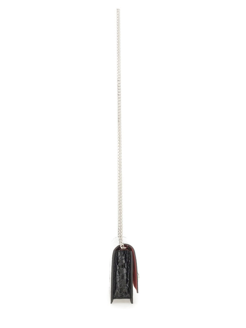 Exquisite mini clutch bag by Alexander McQueen, meticulously crafted from 100% calfskin leather. The sleek rectangular silhouette mimics crocodile skin, enhanced by a striking skull embellishment, symbolizing the brand’s audacious spirit. A sophisticated silver chain strap offers versatility, while the contrasting interior lining elevates the overall aesthetic.