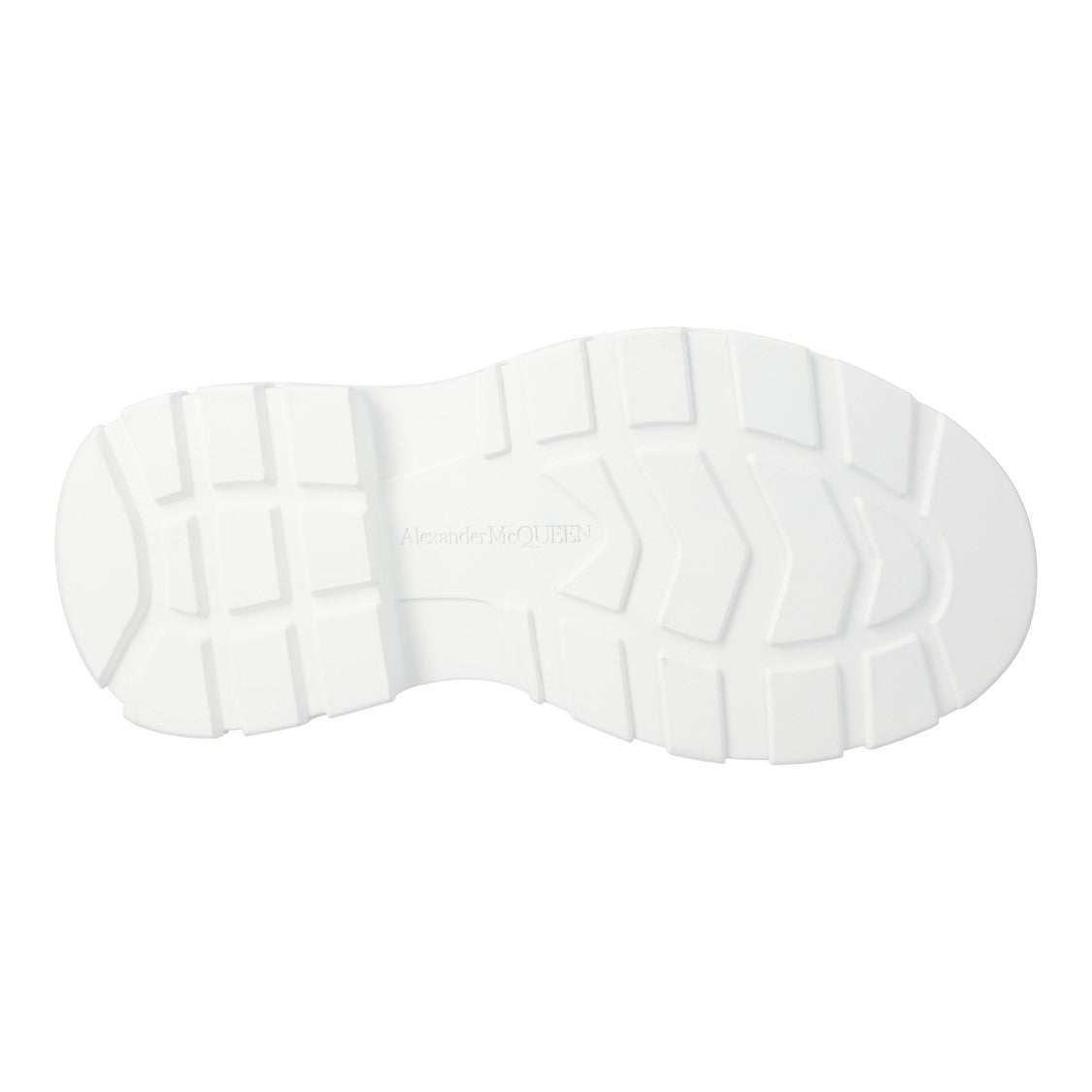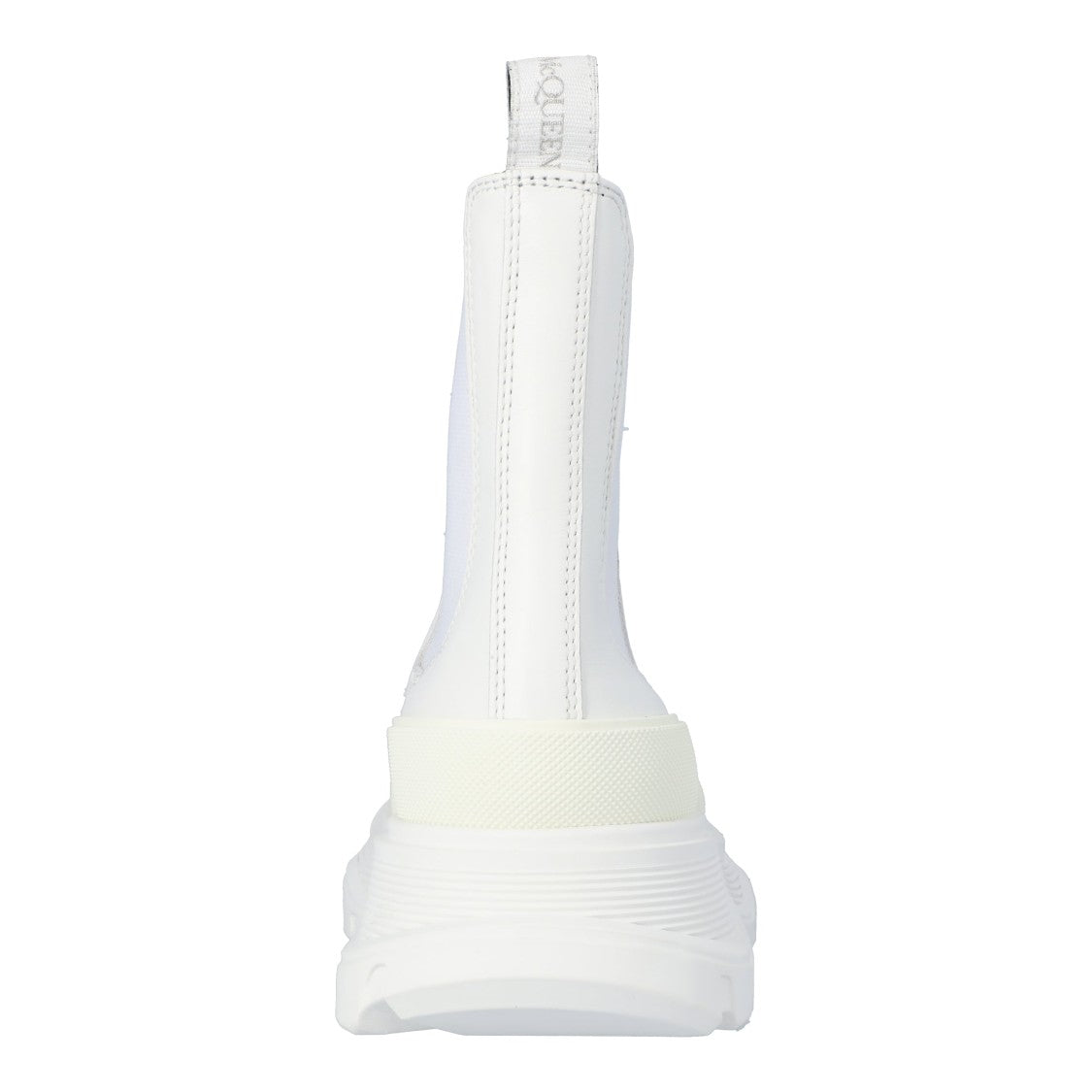 Alexander McQueen presents the Tread Chelsea Boots, a masterful blend of contemporary design and luxurious craftsmanship. These boots feature a smooth white calfskin upper that exudes sophistication, complemented by a bold chunky rubber sole for a striking silhouette. The elastic side panels ensure effortless wear, making them ideal for those seeking both style and functionality. Perfect for modern aesthetics, these boots are a statement piece that elevates any outfit.