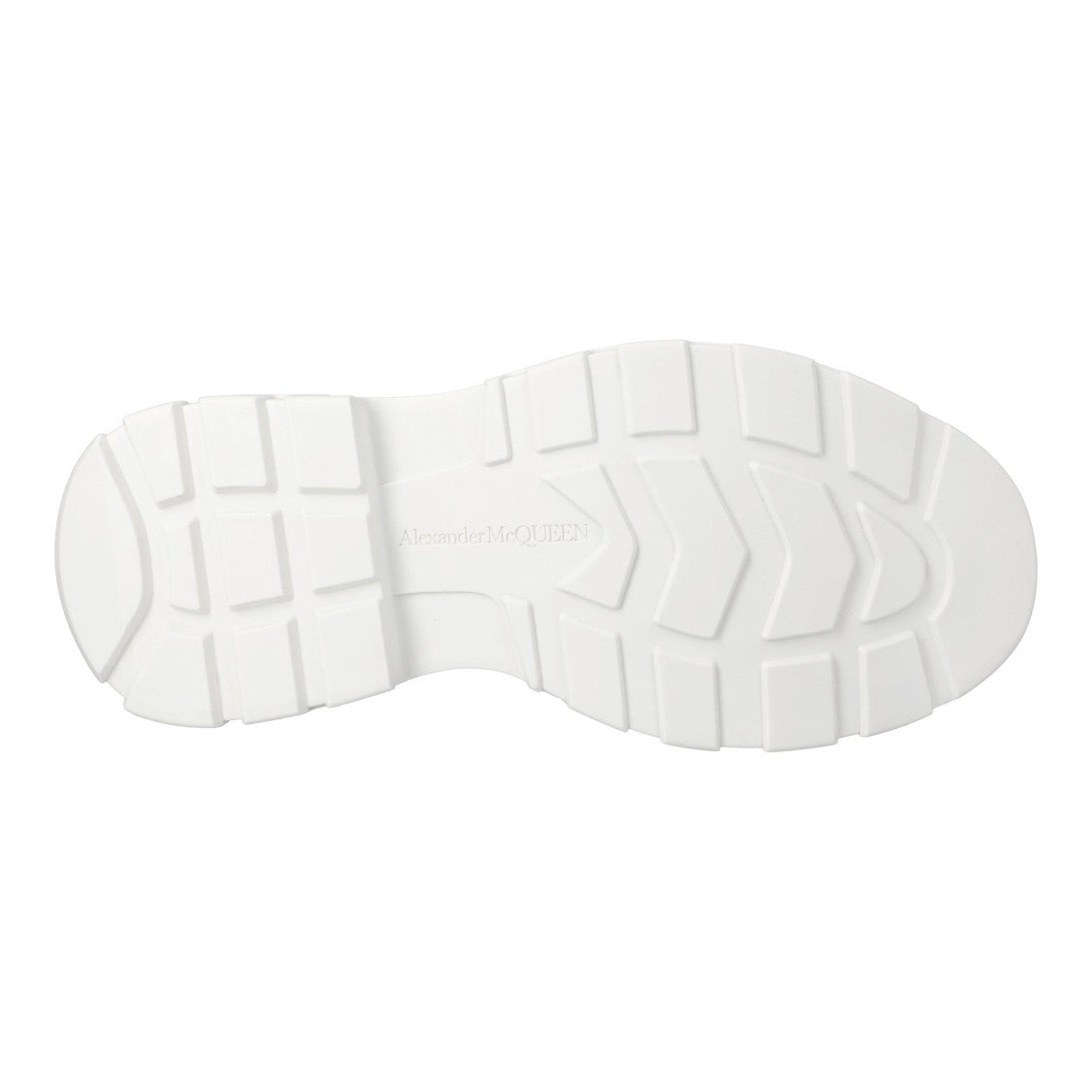 These high-top Tread Boots from Alexander McQueen are a striking addition to any wardrobe. The vibrant multicolored graffiti canvas upper is complemented by a sturdy white rubber sole. With a lace-up front and padded collar, they offer both style and comfort, making them a standout choice for modern fashion enthusiasts.
