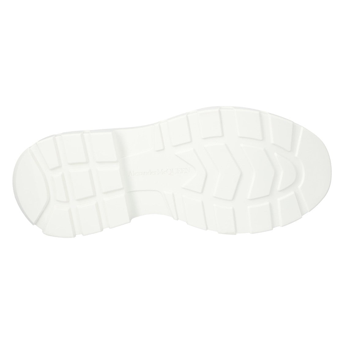 Alexander McQueen's Tread Sneaker showcases a striking blend of navy and grey calfskin, perfectly contrasted by a chunky white rubber sole. Featuring a lace-up front and unique contrasting stitching, this sneaker exemplifies modern aesthetics while ensuring easy wear with a handy back tab.
