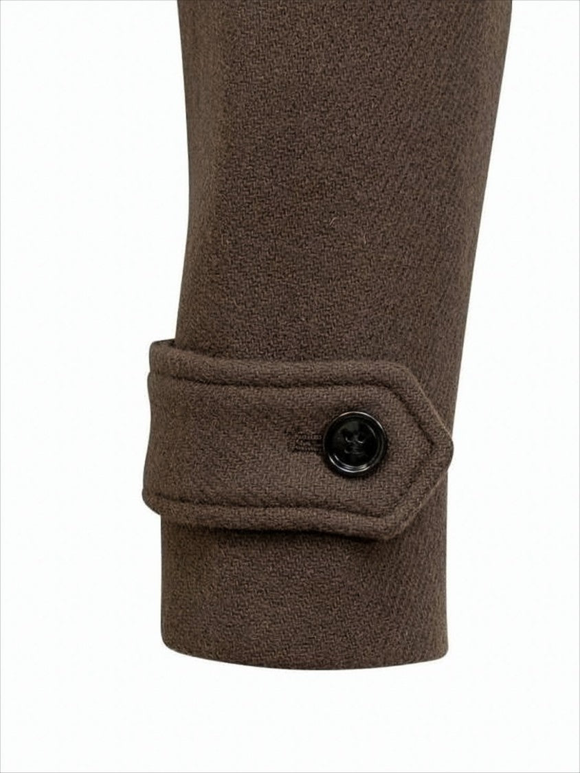 A cropped wool jacket offers warmth and sophistication. Made from premium wool, it showcases a rich brown body paired with a plush cream shearling collar. The button-up front and flap pockets enhance its structured yet cozy silhouette, while buttoned cuffs allow for a personalized fit. Designed with a slightly boxy fit, this jacket is ideal for layering over casual outfits, adding unique charm to any ensemble.