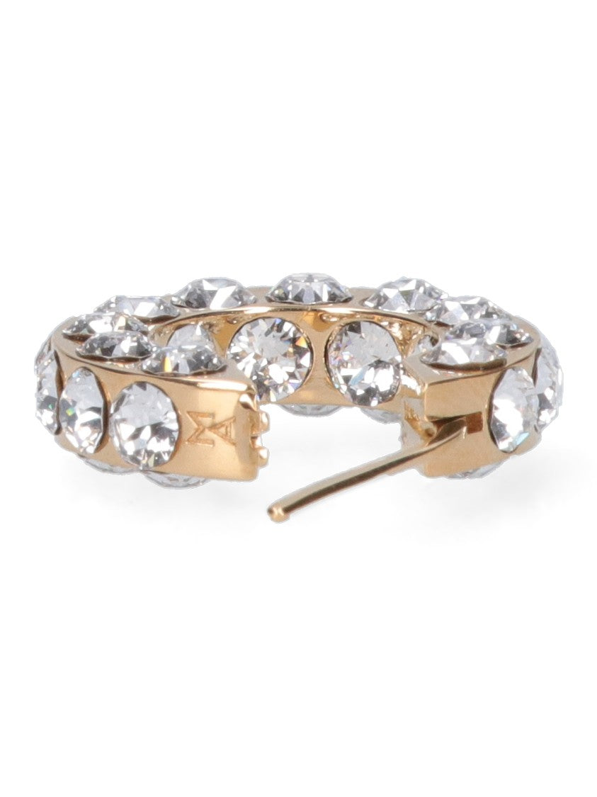 These earrings feature a refined circular design with sparkling silver Swarovski crystals and a shimmering gold finish. Exquisite craftsmanship and luxurious materials make them a statement piece for sophisticated occasions.