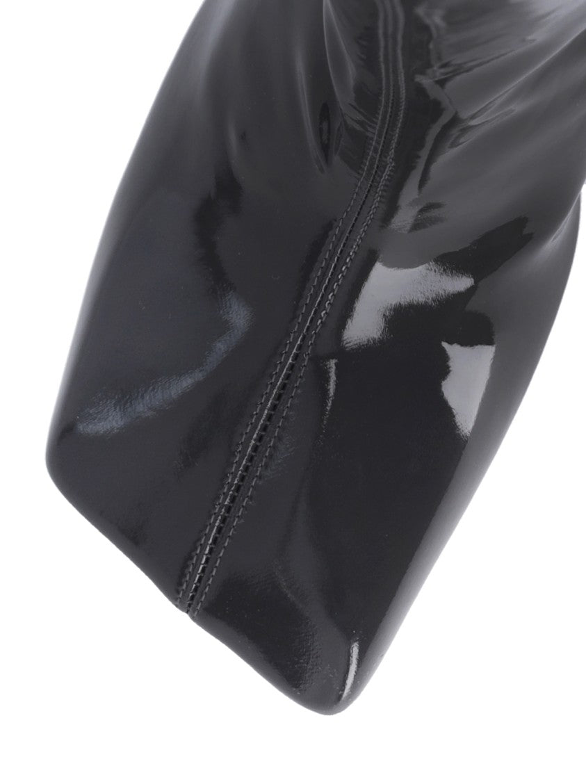 High boots from Amina Muaddi feature a sleek silhouette with a lustrous black patent finish. The design includes a square toe and sturdy square heel, providing stability and a modern touch. A functional side zip closure adds practicality, making these boots a must-have for impactful dressing.