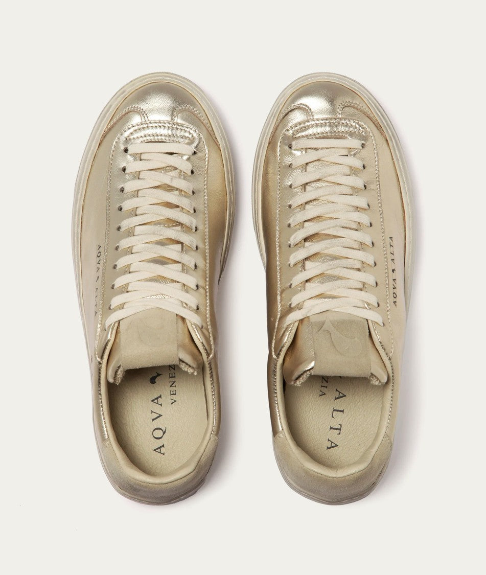 Aqua Alta Venice introduces the Ducato Platinum sneakers, embodying comfort and elegance. The lightweight sole ensures superior cushioning, while the laminated leather upper adds a luxurious sheen. These sneakers seamlessly integrate into casual wardrobes, making them essential for modern lifestyles with a chic, understated appeal.
