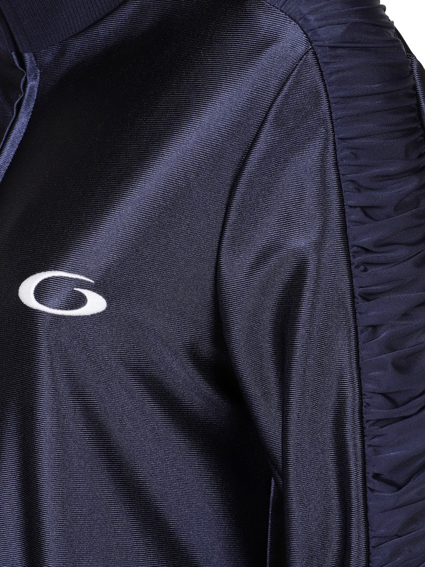 A Fitted Blue Jacket That Embodies Contemporary Sophistication. The High Collar And Full Zip Closure Enhance The Sleek Silhouette, While Gathered Sleeve Detailing Introduces A Unique Texture. Made From Premium Fabric With A Smooth, Shiny Finish, This Jacket Is Perfect For Casual And Sporty Occasions.