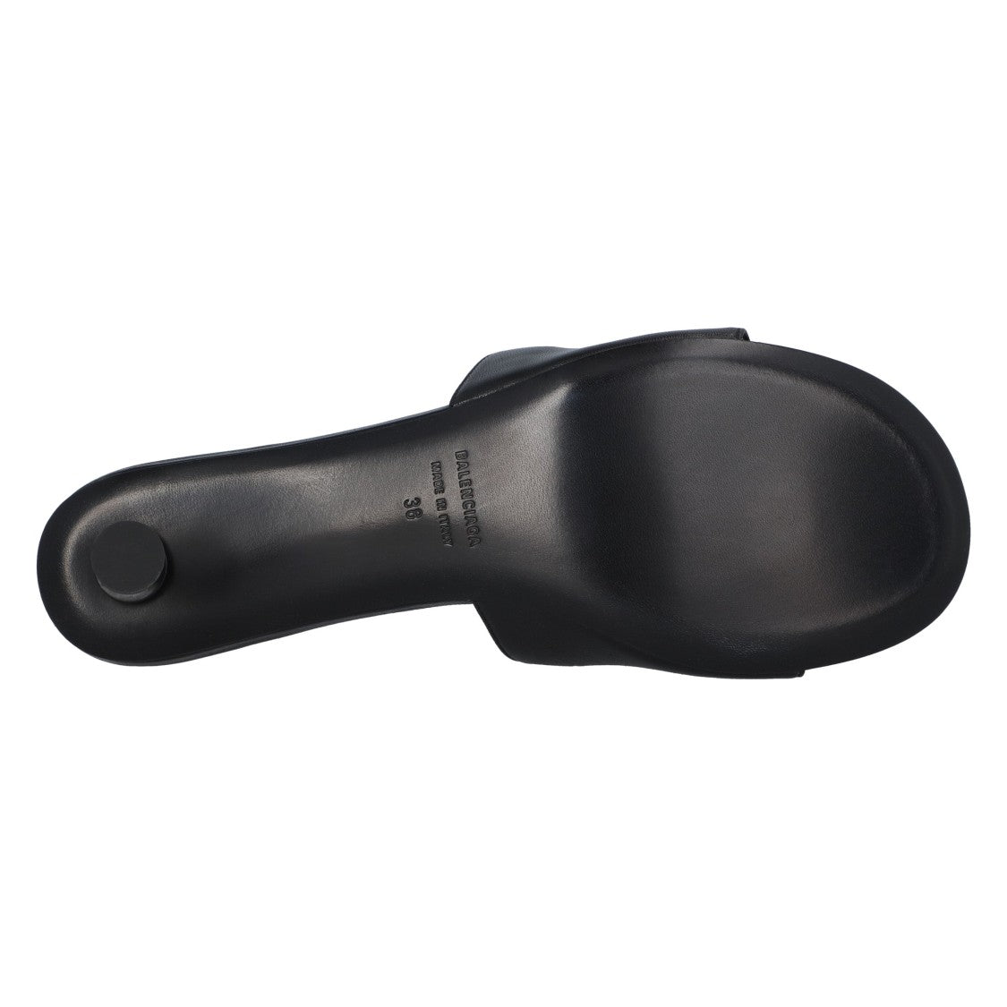 Experience the luxury of Balenciaga's black mules, crafted from premium calfskin leather featuring a striking croc-effect finish. The round-open toe design and sleek slip-on silhouette exemplify minimalist sophistication. A gleaming gold BB hardware detail adds an exclusive charm, ideal for the discerning fashionista looking to enhance her footwear collection.