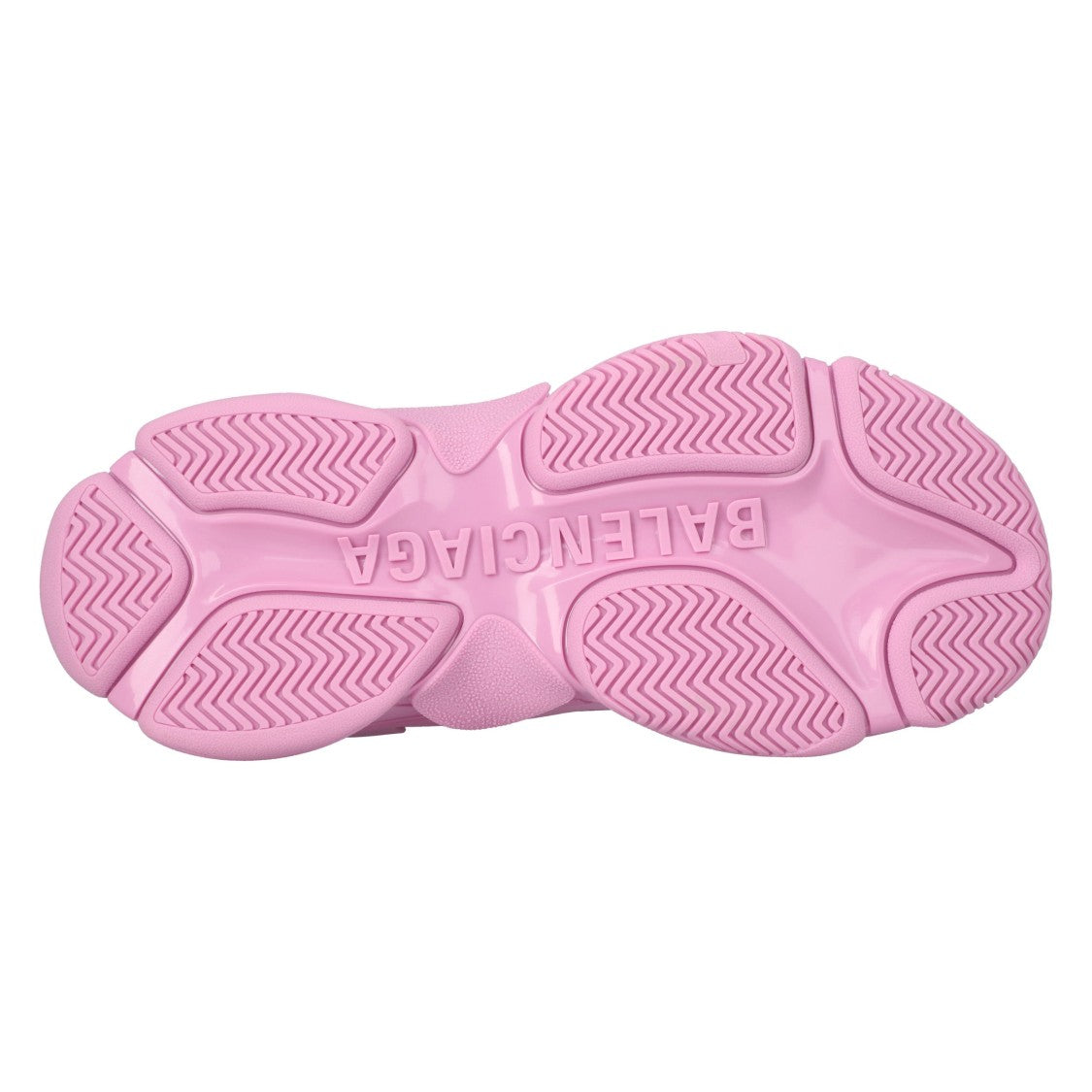 Chunky pink sneakers from Balenciaga, designed with a complex three-layer outsole that showcases innovative craftsmanship. The bold silhouette features embroidered logos, enhanced with a specialized lacing system reminiscent of hiking boots, ensuring both style and functionality. The design is completed with pull loops on the back and tongue.