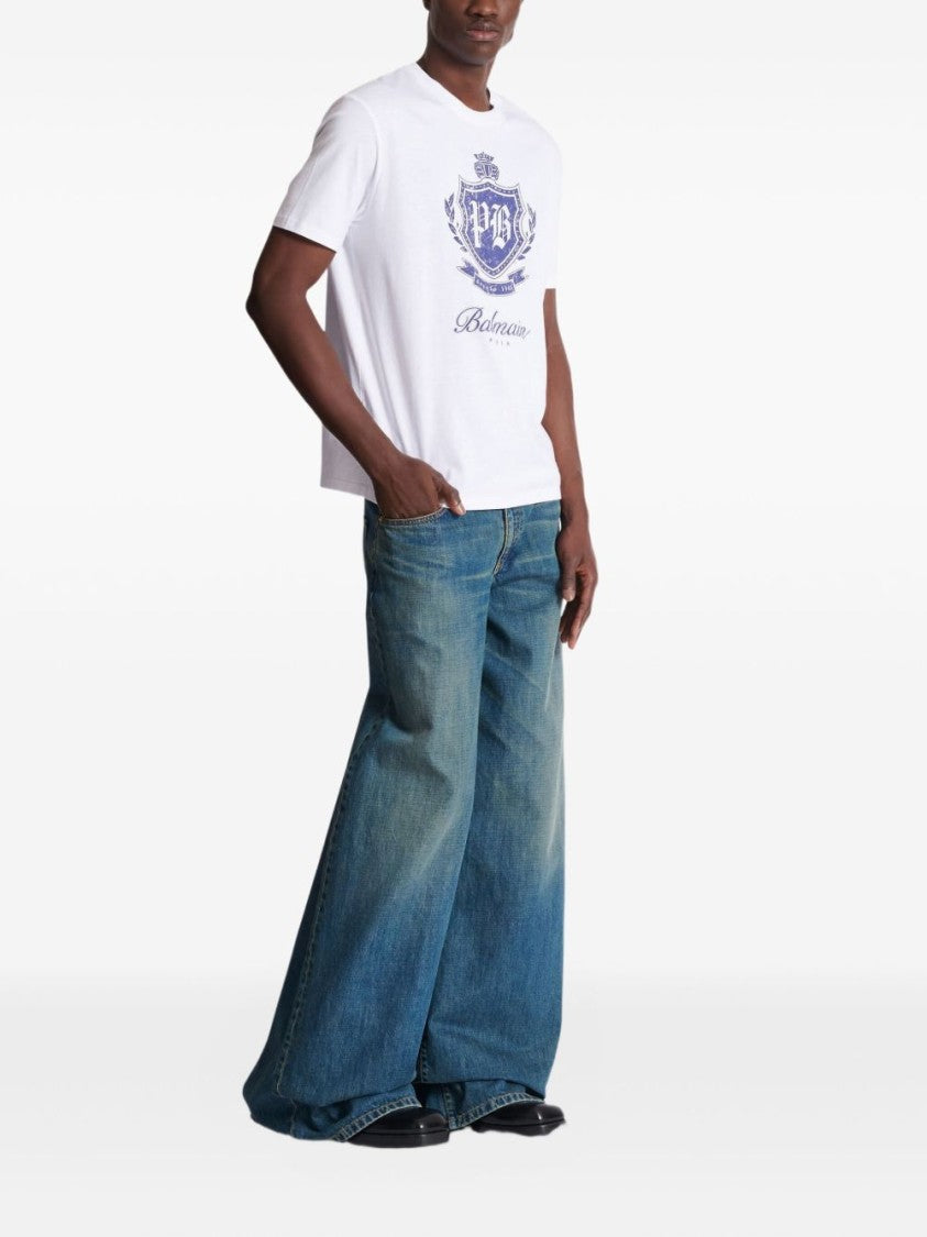 Indulge in the effortless sophistication of Balmain with this graphic-print T-shirt, a hallmark of modern luxury. Crafted in pristine white, it showcases a striking crest design emblazoned across the chest, symbolizing a legacy of elegance and style. The classic crew neck and straight hem provide a balanced silhouette, while the relaxed fit ensures comfort for everyday wear. Perfect for the contemporary gentleman looking to express individuality through refined casual wear.