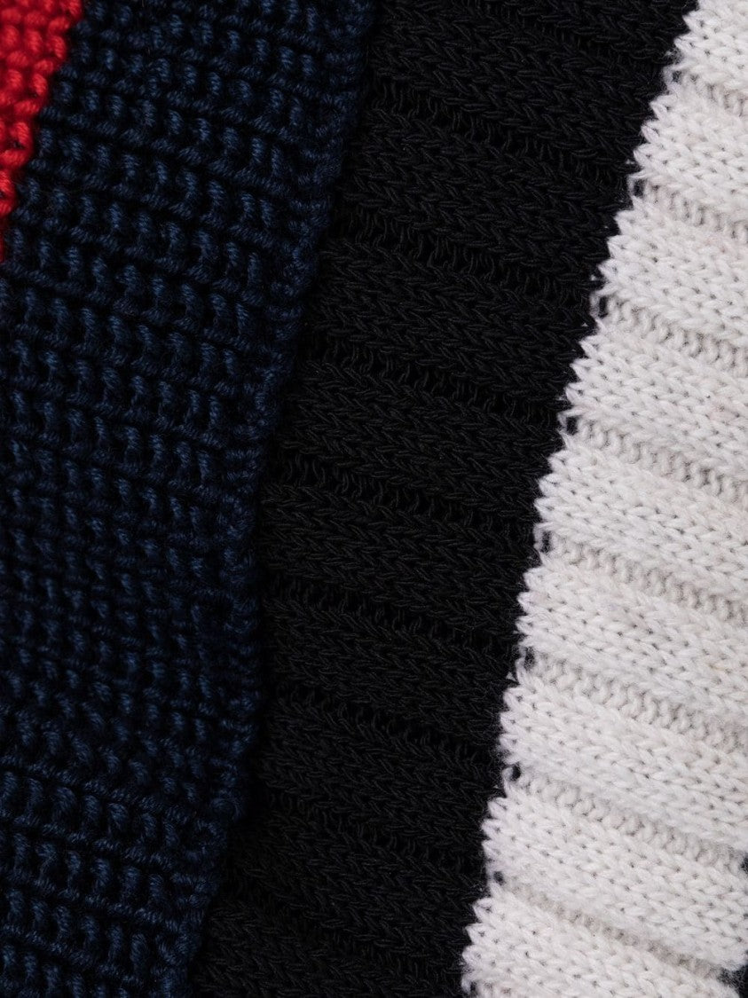 This captivating mini dress showcases a striking striped pattern that transitions from bold red and navy to elegant black and white. Crafted from a premium blend of wool and synthetic fabric, the chunky knit texture ensures warmth and style. Gold-tone buttons adorn one shoulder, elevating its visual appeal. A true statement piece that embodies playful sophistication for any occasion.