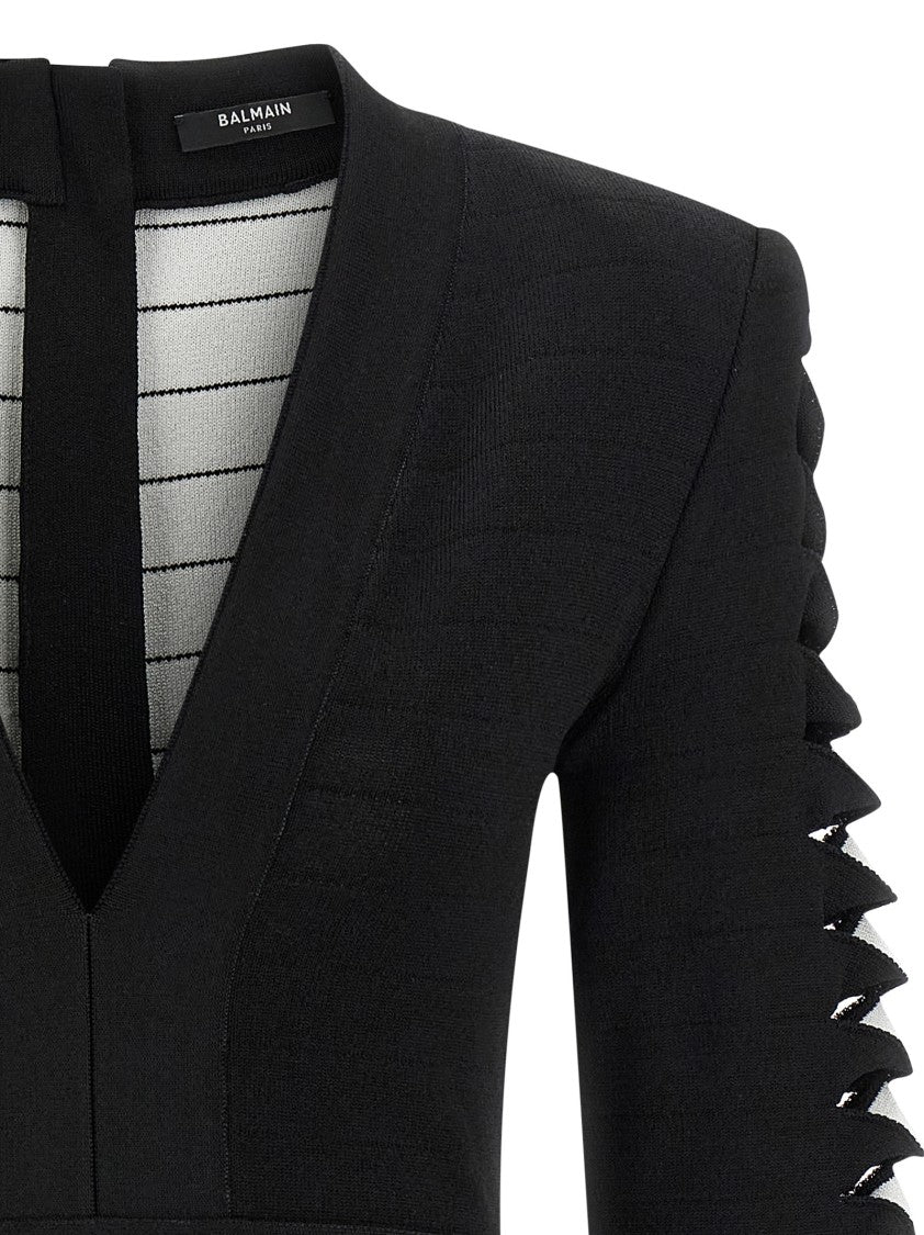 Elevate your evening wardrobe with this Balmain mini dress, a striking blend of sophistication and audacity. Tailored from a luxurious stretch viscose blend, it features a deep front V-neck and padded shoulders for a bold silhouette. Distinctive cut-out details and fabric turn-ups on the long sleeves enhance its allure, while the fitted design accentuates your figure. Finished with a discreet back zip closure, this dress is as functional as it is fashionable.