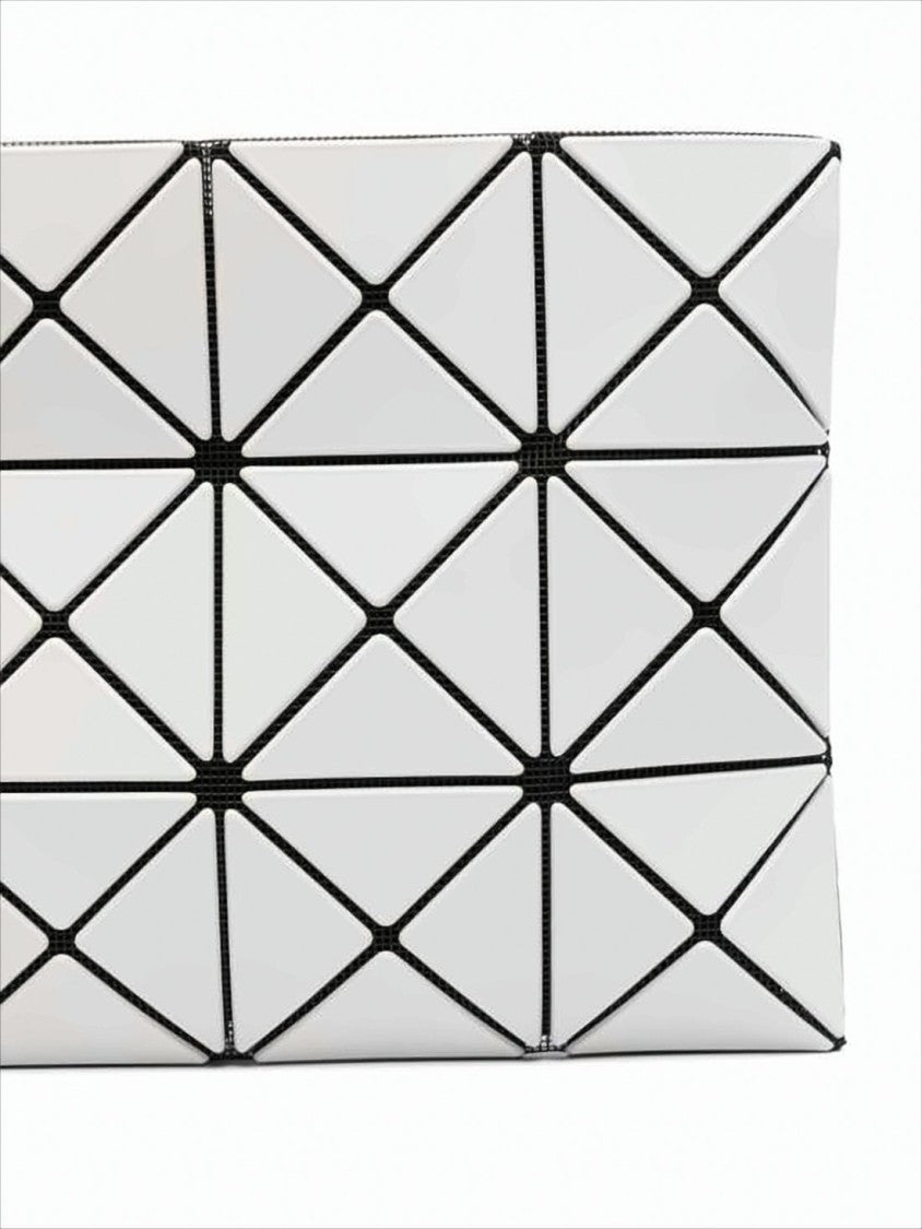 A sophisticated shoulder bag by Baobao, this piece showcases a striking geometric pattern formed by interconnected triangular panels, highlighting a modern architectural aesthetic. Its smooth, glossy exterior is complemented by a structured rectangular shape and a contrasting black adjustable strap, while the interior features a subtle patterned lining with a small pocket for essentials. Perfectly encapsulating contemporary design, this bag is a must-have for the minimalist aficionado.