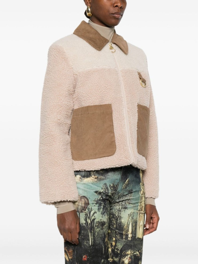 The Malena Jacket by Barbour showcases modern luxury with its soft, textured ecru fabric and relaxed fit. This cropped design includes a unique brown corduroy collar and patch pockets, complemented by gold-tone hardware for a refined touch. Ideal for those who value subtle elegance, this jacket is perfect for casual outings.