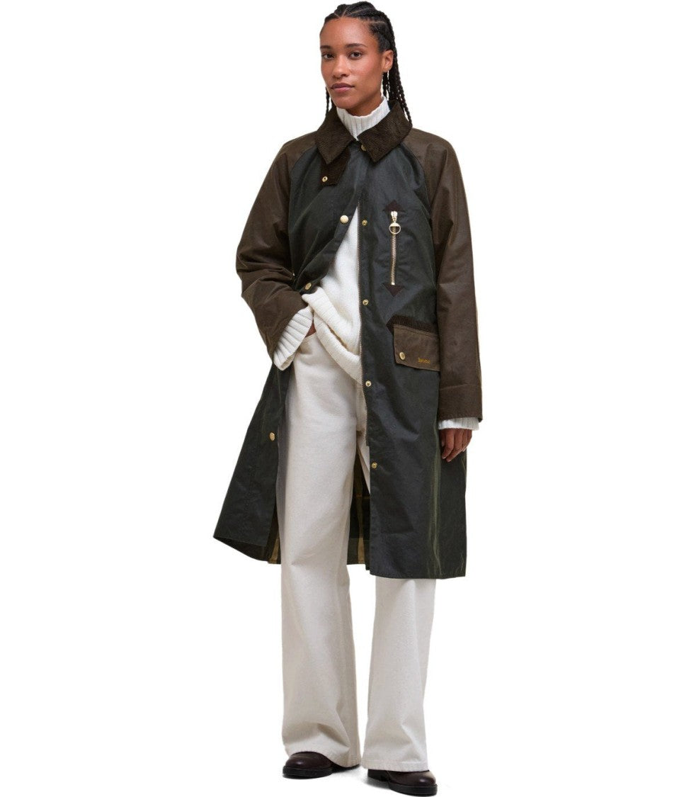 A remarkable long jacket made from waxed cotton in a dual shade of green.