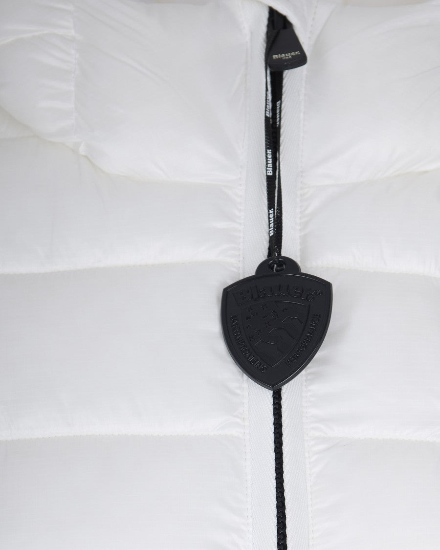Blauer offers a stylish winter jacket made from water-repellent micro ripstop nylon. The fitted design includes a fixed hood with drawstrings, a concealed front zipper, and a drawstring hem for a personalized fit. Inside, there are two pockets—one with a zipper and another with Velcro. The jacket features a contrasting nylon lining and is insulated with Sorona® Aura wadding, complete with a logo patch and loop.