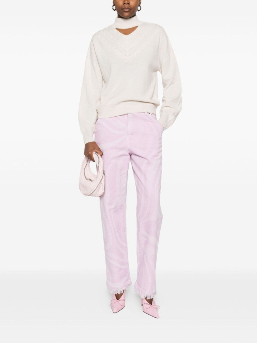 This exquisite sweater by Blugirl is a luxurious blend of 70% wool and 30% cashmere, offering an unparalleled softness against the skin. The piece features a high neckline with a distinctive V-shaped cutout, complemented by subtle cable knit patterns that add texture. Long, slightly puffed sleeves with ribbed cuffs and hem provide a cozy fit, making it a versatile addition to any wardrobe.