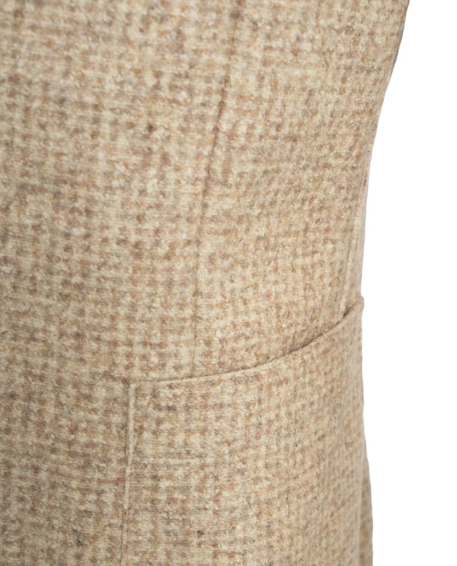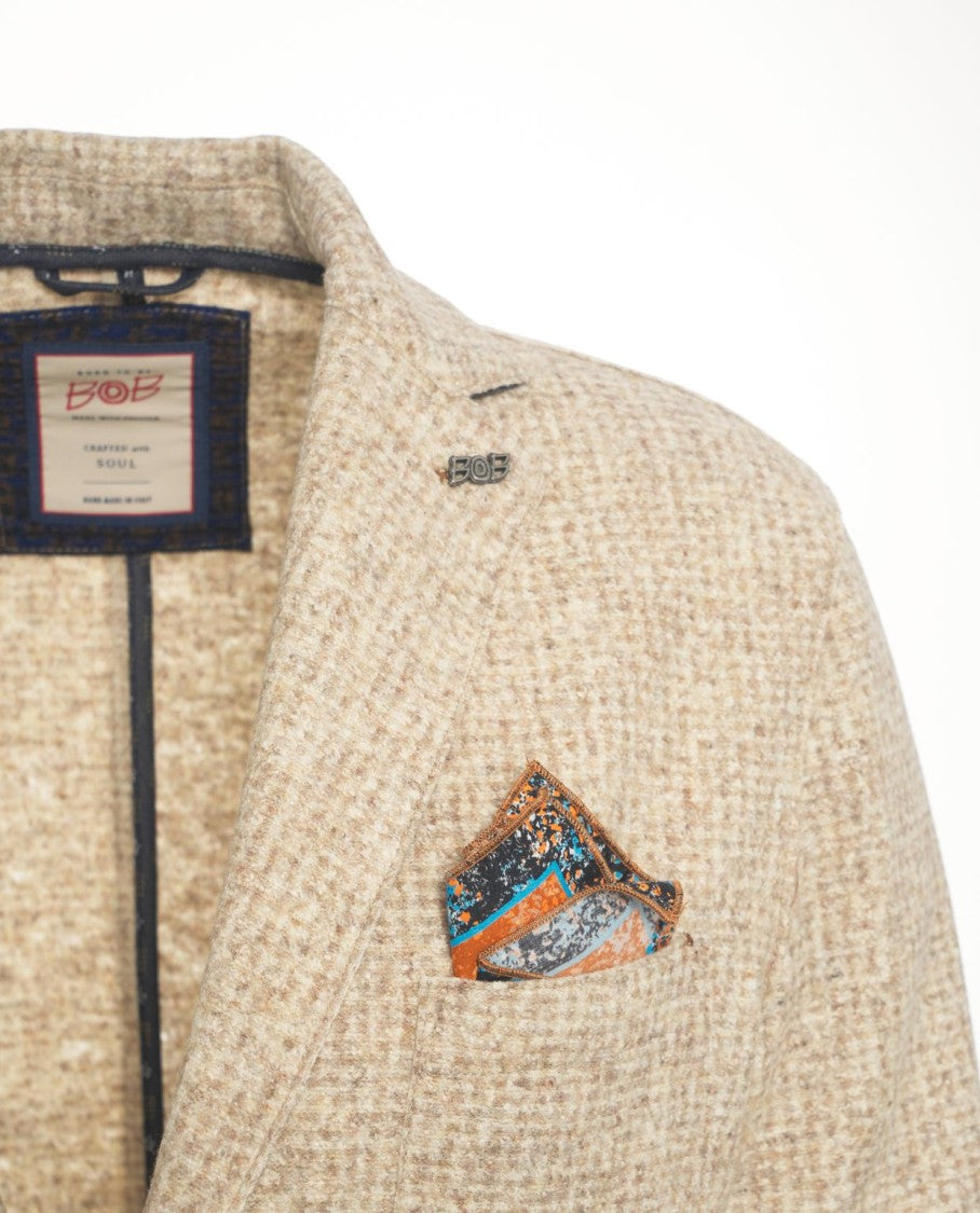 This Bob blazer presents a structured silhouette made from a cotton blend with a checkered pattern in beige tones. A single-button closure and classic lapel enhance its sophisticated design, while practical patch pockets add functionality. A vibrant pocket square provides a touch of flair, making it suitable for various occasions.