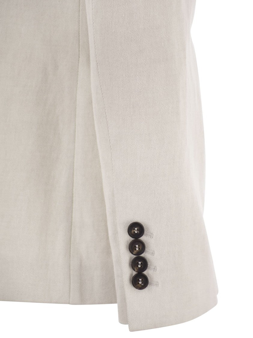 A refined tailored jacket by Brunello Cucinelli, crafted from a blend of cotton and linen for a soft, fresh aesthetic. The silk-blend crepe half lining provides comfort, while horn button fastenings and flap welt pockets enhance the sophisticated design. A single back slit adds a modern touch, making this piece an elegant addition to any wardrobe.