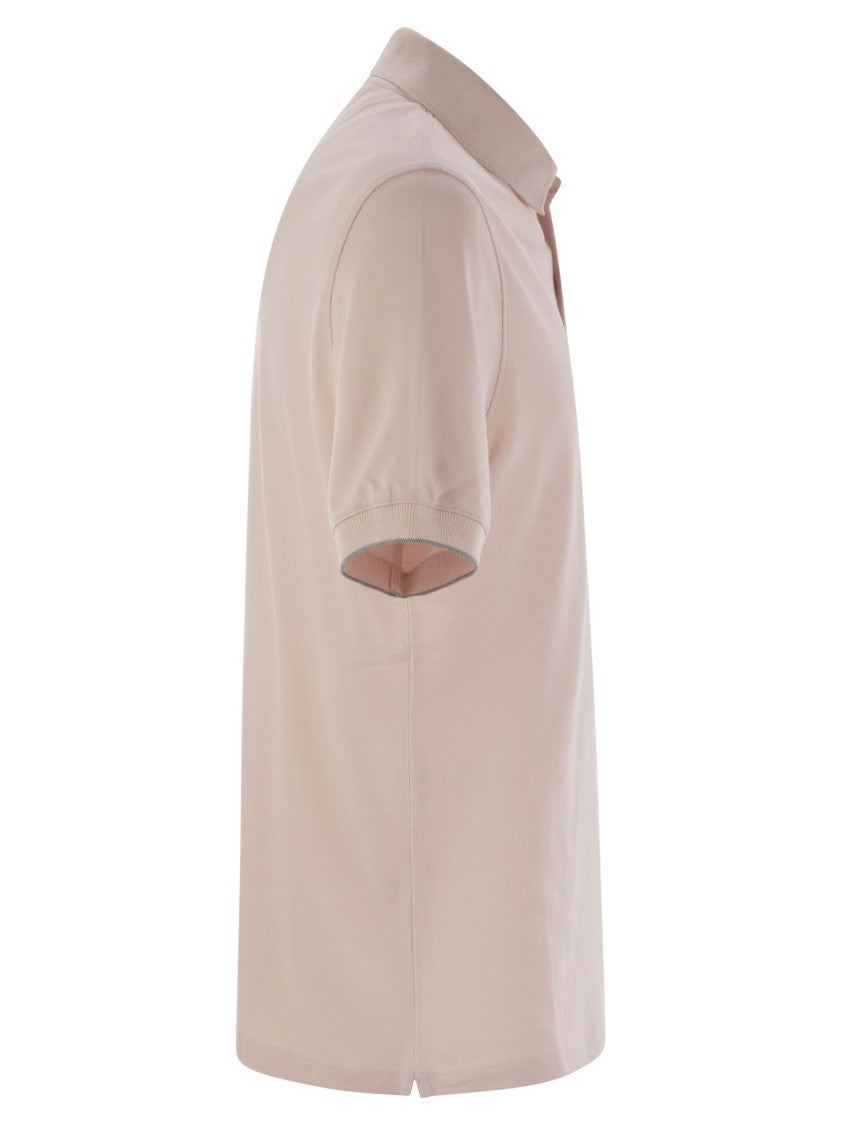 Brunello Cucinelli introduces a luxurious cotton polo shirt perfect for casualwear. Made from 100% soft cotton, it includes a rib knit collar, contrasting cuffs, and a refined logo on the chest, adding to its versatility. The regular fit and riveted hem create a sophisticated silhouette suitable for various occasions.