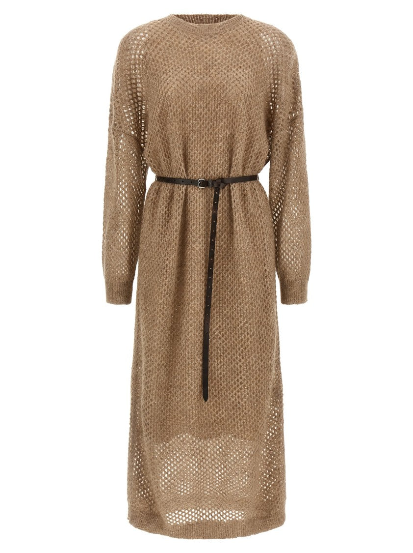 Brunello Cucinelli Offers A Captivating Long Dress Made From A Luxurious Blend Of Mohair, Wool, And Cotton. A Unique Mesh Design Showcases Shimmering Sequins, While A Round Neckline, Long Cuffed Sleeves, And Dropped Shoulders Enhance Its Elegance. The Ensemble Includes A Removable Silk Blend Petticoat And A Chic Leather Belt For Versatile Styling Options.