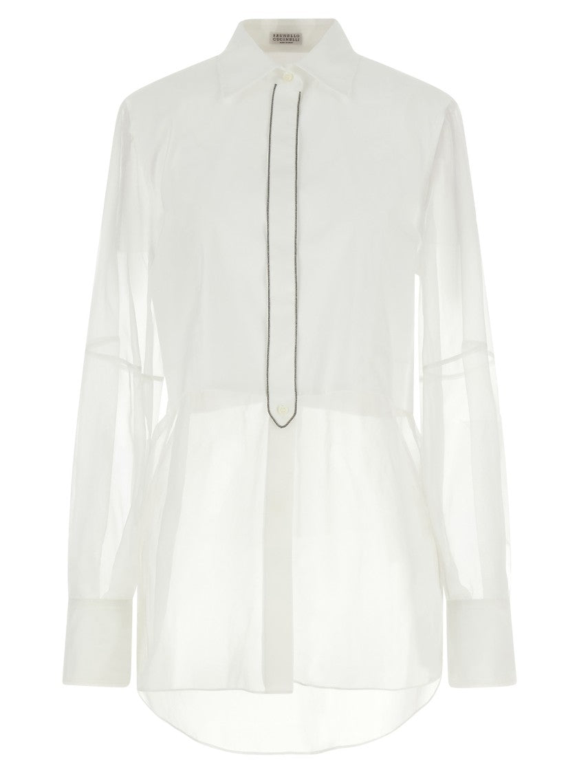 Created by Brunello Cucinelli, this long-sleeved top features a double-layer design with a solid cotton poplin bodice and sheer organza sleeves. A classic collar and front button closure with monile detail add delicate charm, while long cuffed sleeves provide structure, blending refinement and grace.