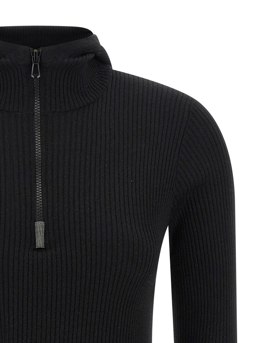 This Hooded Sweater By Brunello Cucinelli Showcases A Luxurious Combination Of Cashmere And Stretch Silk. The Ribbed Texture Enhances Its Appeal, Featuring A Half Zip With A Unique Monile Detail, Long Sleeves, And A Stylish Raw Cut Hem. This Piece Embodies Modern Luxury And Sophisticated Casual Style.