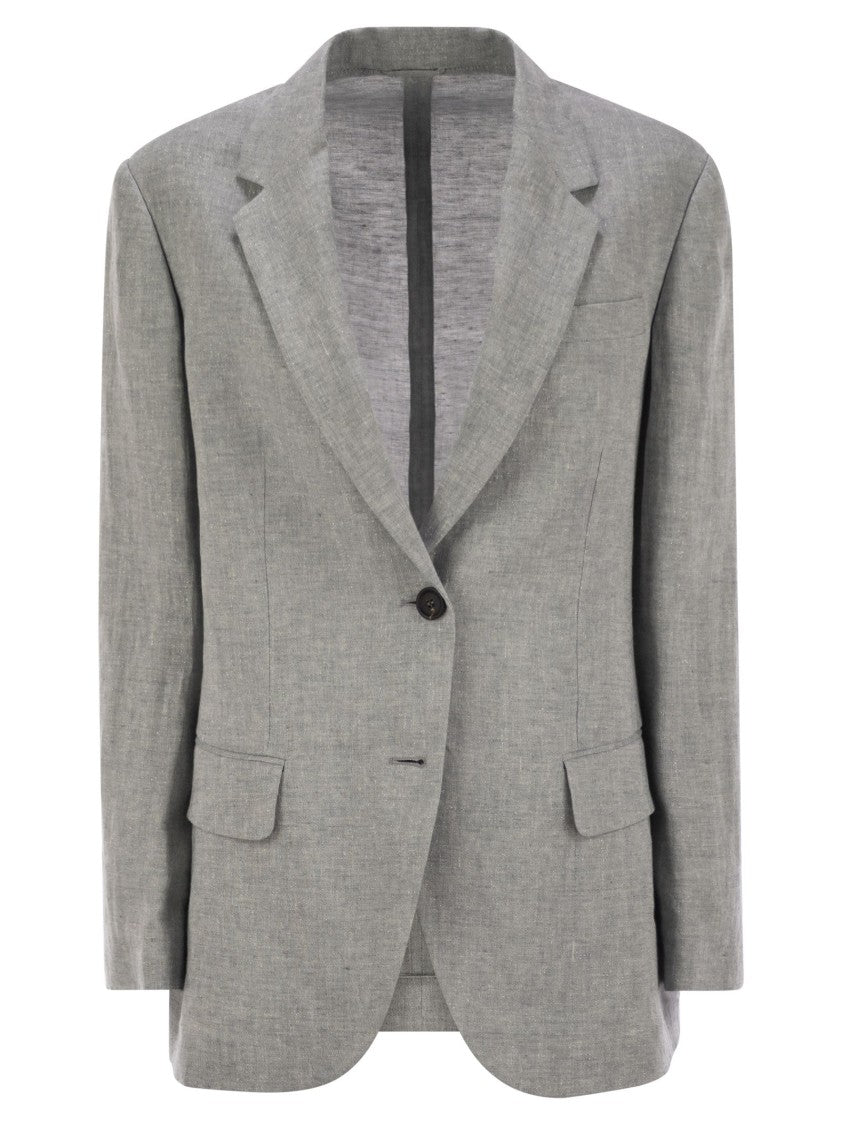 Brunello Cucinelli introduces the Sparkling linen canvas jacket, a luxurious piece that combines lamé yarn with soft linen fibers for a shiny, tailored look. Its unstructured design reflects light beautifully, while the fitted waist enhances the silhouette. A jewel embroidery at the collar adds sophistication, embodying the brand's signature style.