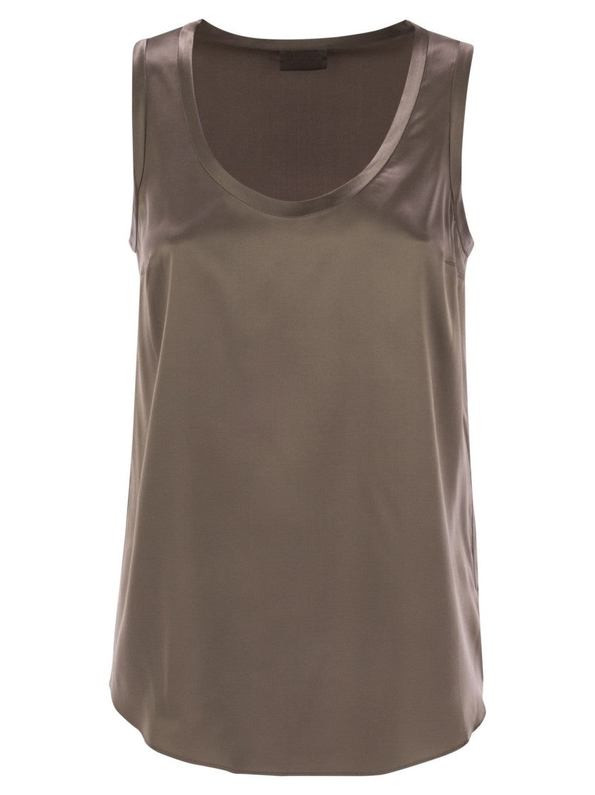 Brunello Cucinelli introduces a reversible stretch silk satin top that merges elegance with comfort. Its flowing silhouette, highlighted by a wide crew neckline and bare shoulders, reflects timeless sophistication. The lustrous silk satin offers a glossy effect, enhancing its luxurious appeal. A touch of elastane provides ease of movement, making it an essential piece for refined women's wardrobes.