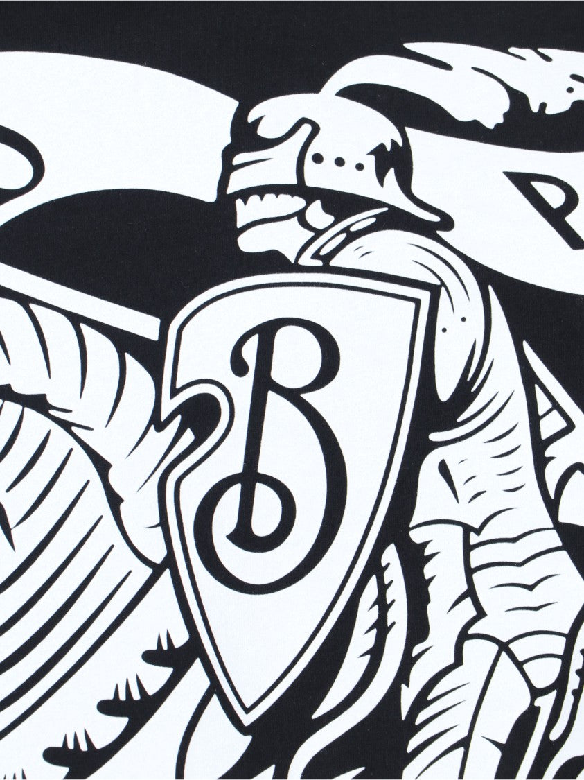 Experience the iconic craftsmanship of Burberry with this Black Cotton Jersey T-Shirt featuring the esteemed Equestrian Knight Design in vivid white. A crew neck and short sleeves highlight refined simplicity, complemented by ribbed finishes for a polished touch. Ideal for enhancing casual outfits.