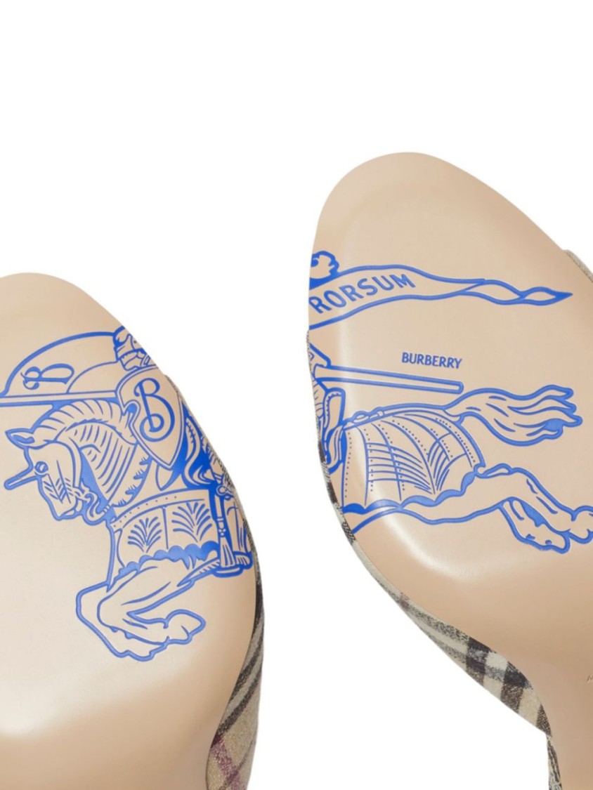 Burberry presents its plaid pattern stiletto sandals, a sophisticated choice that captures modern elegance. The open toe design emphasizes the sleek silhouette, crafted from textured fabric that enhances the contemporary appeal. Ideal for elevating any ensemble, these sandals embody an effortless style that transitions seamlessly from day to night.