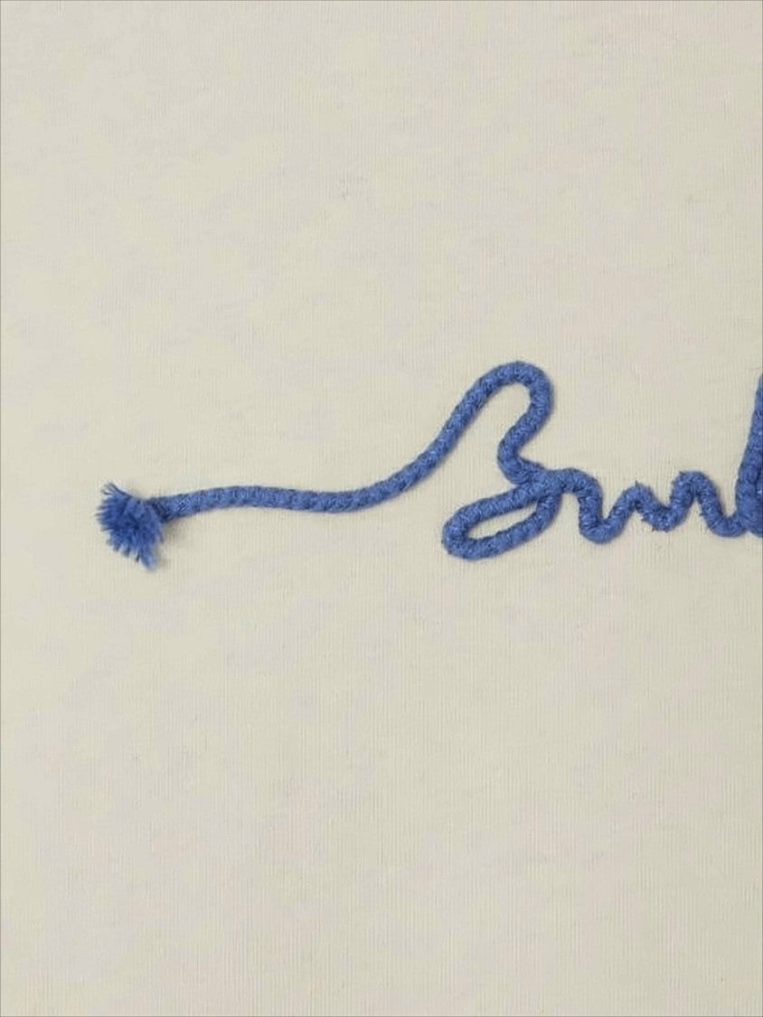 Enhance your casual style with this short-sleeved t-shirt from Burberry, showcasing a soft light beige color. A unique blue embroidered script across the chest adds a refined detail. Made from premium 100% cotton, this shirt ensures comfort and versatility for various occasions.