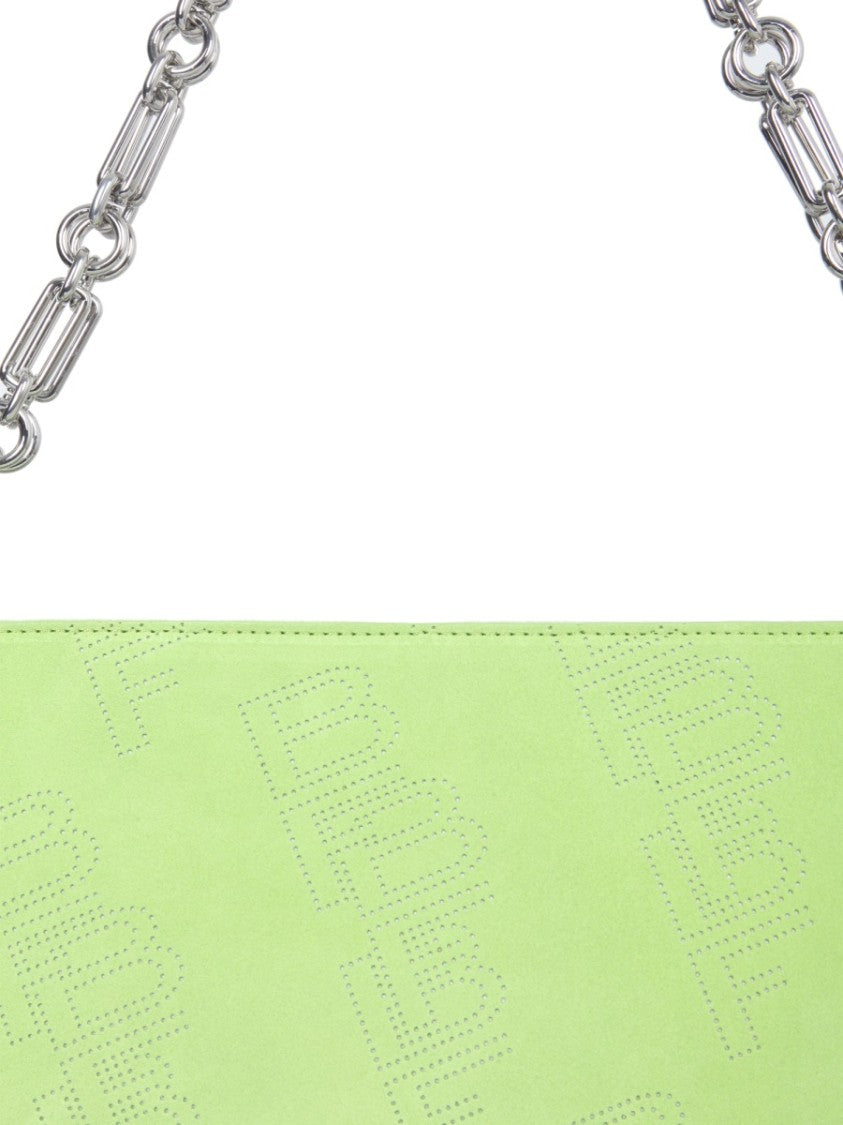 By Far presents a refined shoulder bag, meticulously crafted from 100% leather featuring an elegant embossed pattern. The bag combines a structured rectangular silhouette with a unique handle made of leather and chunky silver chain links, adding a vintage-inspired allure. Stylish yet functional, it measures 16.5 cm in height, 33 cm in width, and 3 cm in depth, making it ideal for any occasion. Perfect for the modern woman who appreciates timeless design and quality craftsmanship.