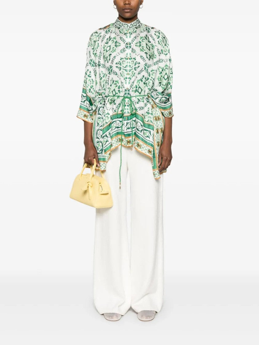 CAMILLA's Corridor of Calm Shirt exudes effortless elegance with its relaxed silhouette and high neckline. Crafted from 100% luxurious silk, it features an intricate all-over graphic print adorned with delicate crystal embellishments. Short side slits enhance movement, while the front button fastening and adjustable drawstring waist offer versatile styling options. This exquisite piece is perfect for elevating any casual ensemble or adding a touch of sophistication to your everyday look.