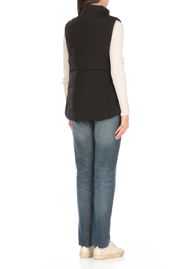 The Canada Goose Freestyle Husky vest combines functionality with style. It features a high neck for warmth and a prominent front patch logo. The vest includes a mix of snap buttons and zip fastening, along with practical side zip pockets and an interior welt pocket, ideal for active lifestyles.