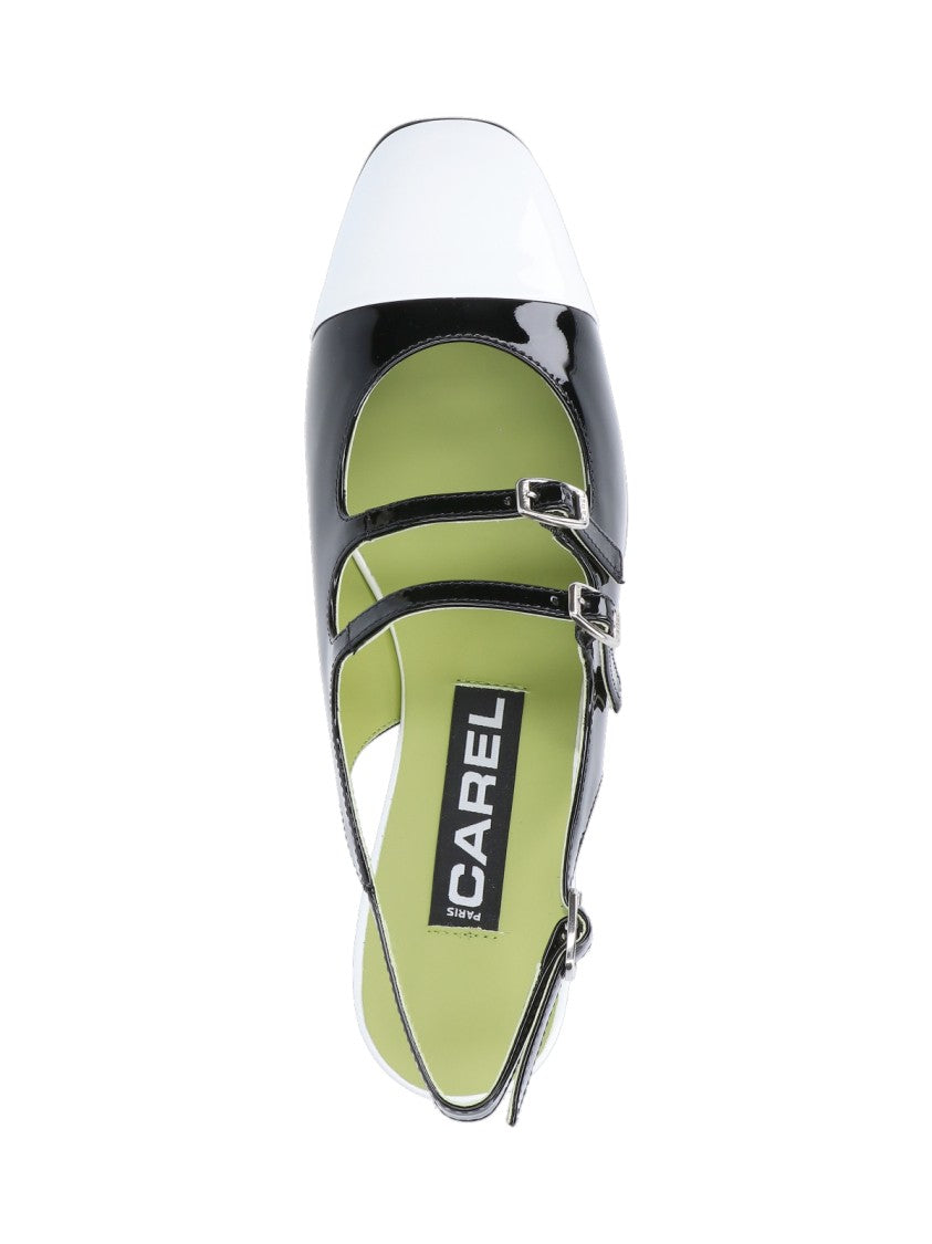 These Mary-Jane shoes by CAREL embody modern elegance with their sleek patent leather upper and contrasting round toe. The adjustable straps at the front and back provide a secure fit, while the square white heel adds a contemporary flair. With a durable leather sole, these shoes combine style with sustainability, crafted from certified materials (LWG).