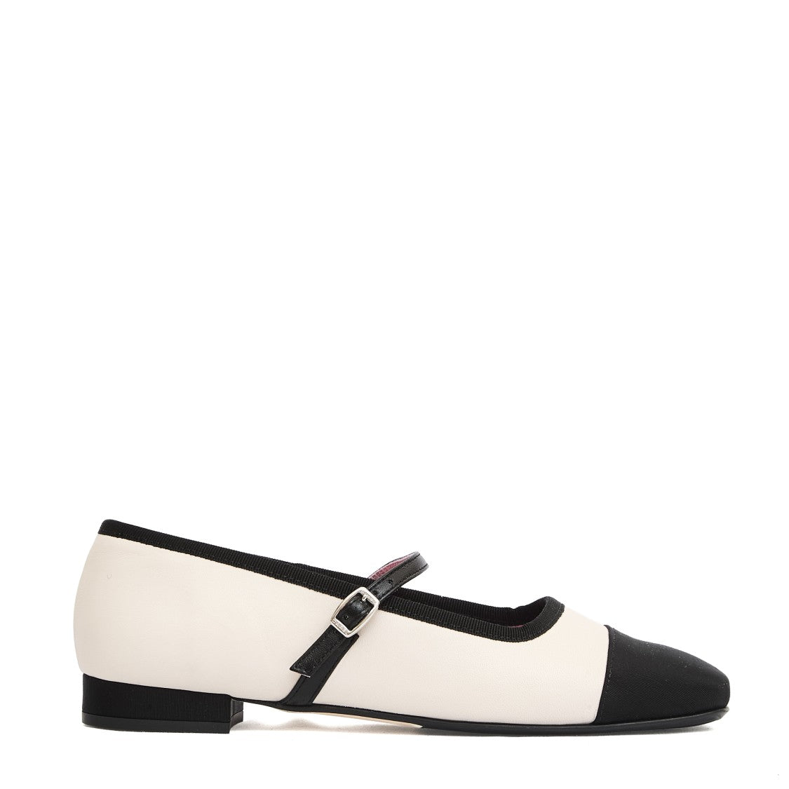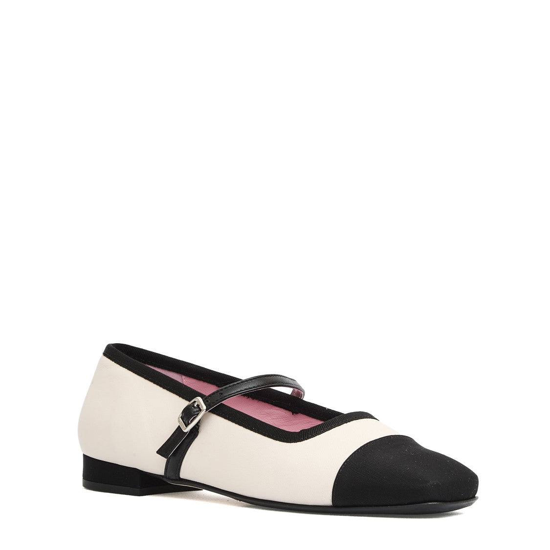 Timeless elegance defines these ballerina flats by Carel Paris, featuring a sumptuous beige leather body paired with a striking black grosgrain toe cap and trim. Attention to detail is evident in the 2 cm heel and adjustable strap, ensuring an impeccable fit. Luxurious leather lining and sole provide comfort and durability, making these flats a valuable addition to any discerning wardrobe.