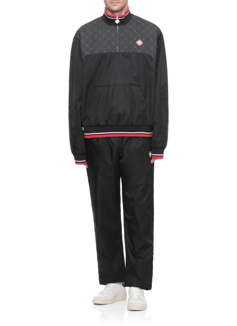 Indulge in the exceptional craftsmanship of the Casablanca sweatshirt, designed for the modern man. This piece features a striking high neck and a secure zip closure, perfect for effortless style. The long sleeves and front zip pocket enhance its practicality, while the ribbed trims adorned with contrasting red and white details add a touch of flair. A subtle tone-on-tone monogram pattern graces the upper chest and sleeves, celebrating the brand's identity, complemented by a logoed front patch that embodies luxury.