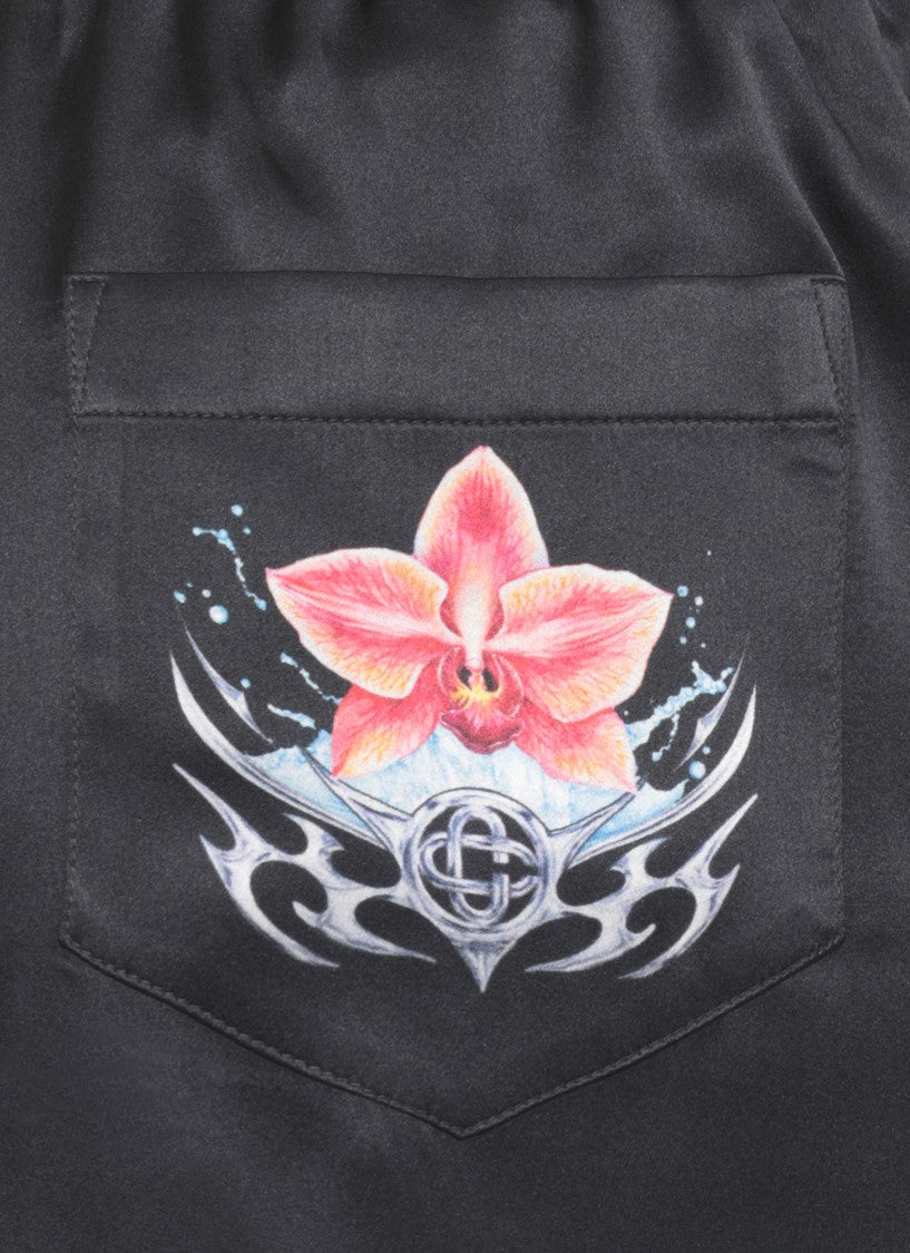 Experience effortless chic with these Casablanca silk bermuda shorts designed for the modern gentleman. The smooth black fabric beautifully contrasts with the striking gradient blue hem, complemented by a unique blades print at the edges and a refined floral emblem on the back pocket. Functional side slit pockets and an elastic waistband with drawstring ensure comfort and practicality, making these shorts a staple for casual outings or warm weather adventures.