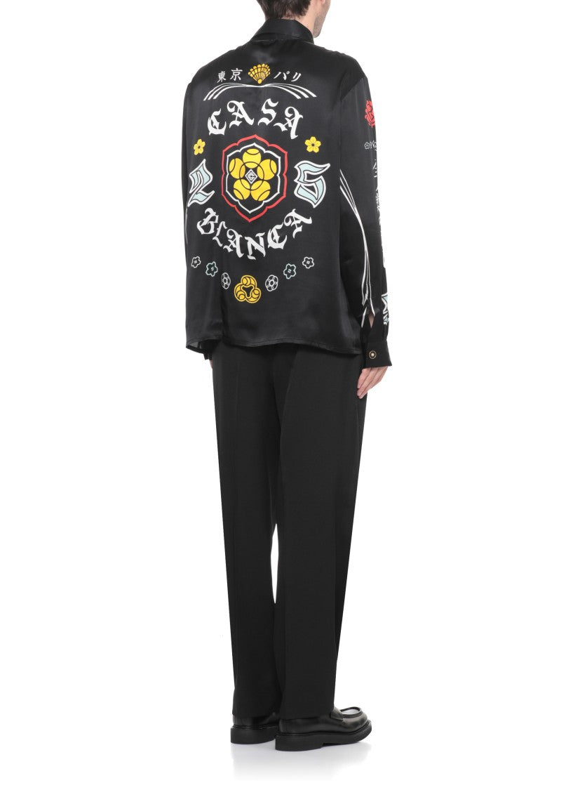This exquisite silk shirt from Casablanca features a distinctive black base with a vibrant Bosozuku pattern, showcasing Japanese characters and symbolic motifs. It includes a classic collar, button fastening, and long sleeves with buttoned cuffs. A front welt pocket adds refinement, while the back is highlighted by a striking graphic design filled with floral and emblematic details.