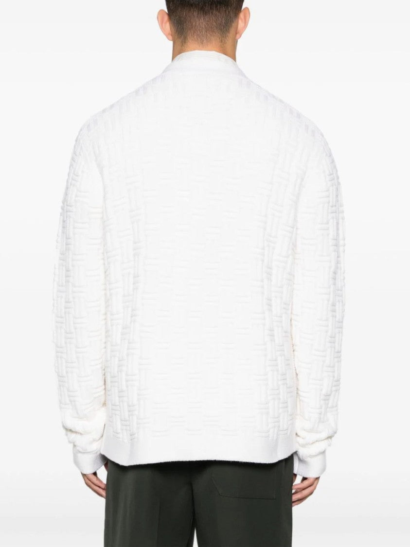This Casablanca cardigan showcases a textured 3D-knit design in a light beige hue. A V-neck and front button fastening enhance its style, while ribbed cuffs and hem provide a snug fit. Two front patch pockets add practicality, making it ideal for layering on cool days.