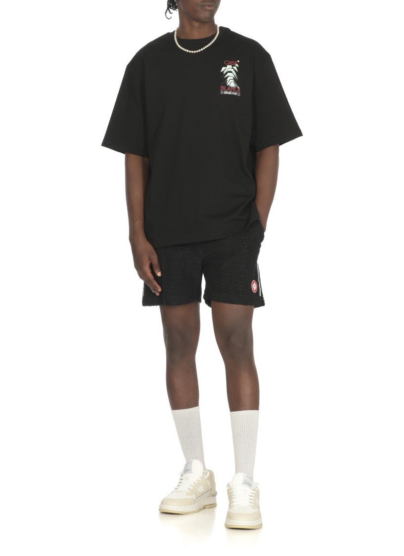 A striking black cotton t-shirt that embodies urban sophistication. The classic crewneck design and short sleeves are complemented by a bold Frosty Mountain print in contrasting hues on both the front and back. Crafted from soft Casablanca cotton, it promises comfort and versatility for casual outings.