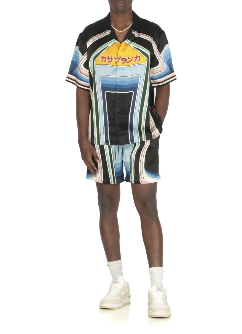 Crafted from luxurious black silk, these Bermuda shorts by Casablanca showcase a bold all-over contrasting logo print. The elastic waist with adjustable drawstrings ensures a comfortable fit. Designed with practicality in mind, they feature two side slit pockets and a rear welt pocket for essentials. Perfect for enhancing any casual or sporty look.