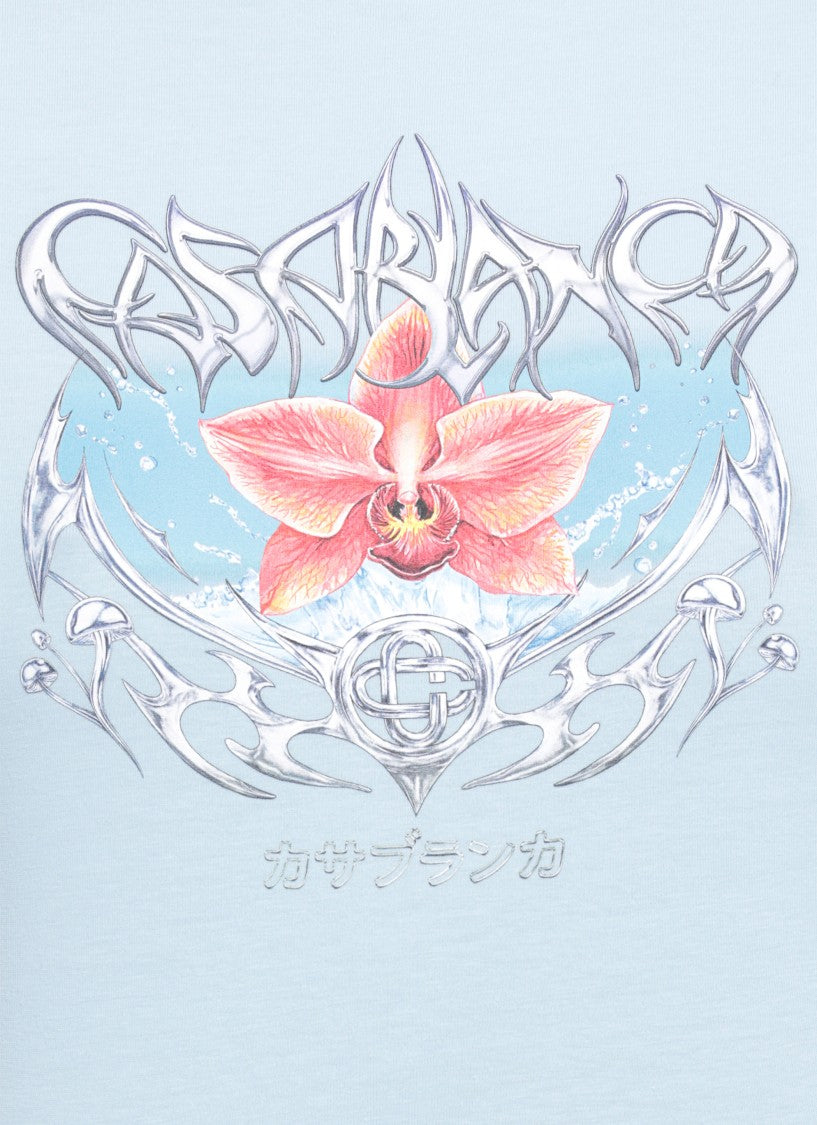 Crafted by Casablanca, this light blue cropped cotton t-shirt embodies effortless style with its round neckline and short sleeves. The front is adorned with a striking contrasting color print featuring intricate floral and graphic designs, seamlessly blending comfort with contemporary flair. Perfect for casual outings, this t-shirt enhances your wardrobe with its versatile appeal.
