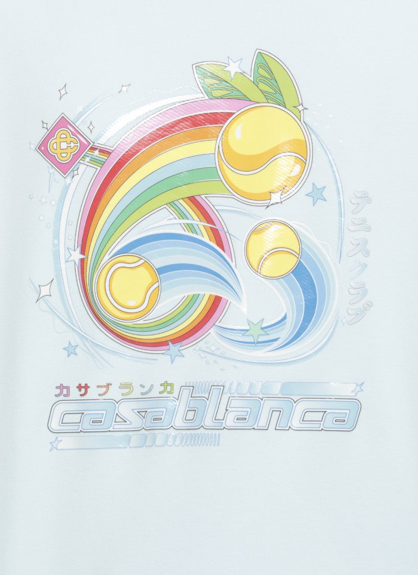 Immerse yourself in the playful elegance of this light blue Casablanca sweatshirt, featuring a vibrant manga-inspired tennis ball print accented with rainbow and star details. Crafted from premium Casablanca cotton, it offers a relaxed fit with a round neckline and long sleeves finished with ribbed trims, perfect for casual outings or lounging in style.