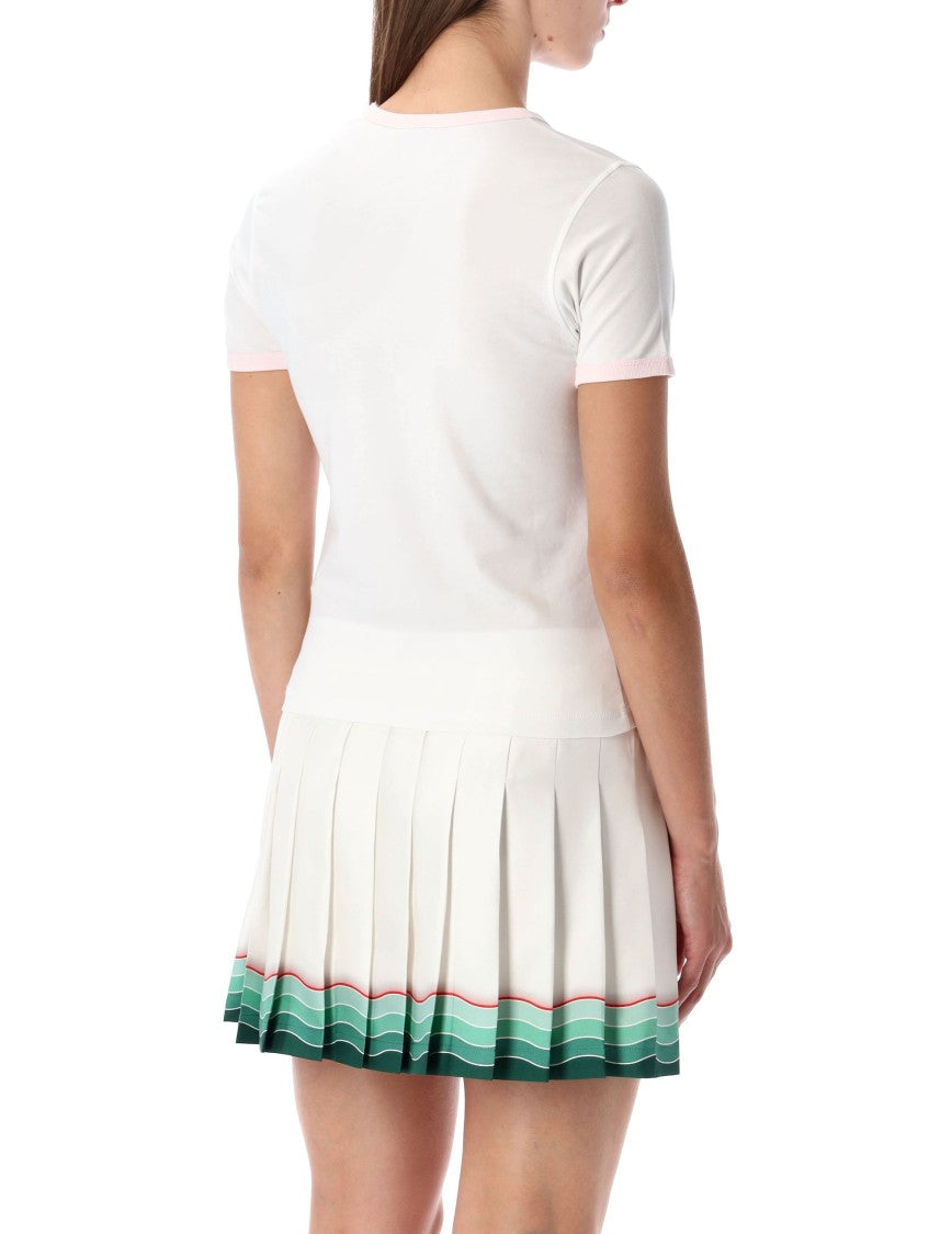 Casablanca presents a fitted short-sleeve tee that radiates vibrant fun with its eye-catching graphic of an orange mascot, complete with tennis rackets and playful stars. This shirt features a soft pink trim along the round neckline and sleeve cuffs, offering a delightful contrast against the pristine white base fabric. Perfect for adding a whimsical touch to your casual wardrobe while celebrating your love for the sport, this tee invites a sense of spirited energy and enjoyment.