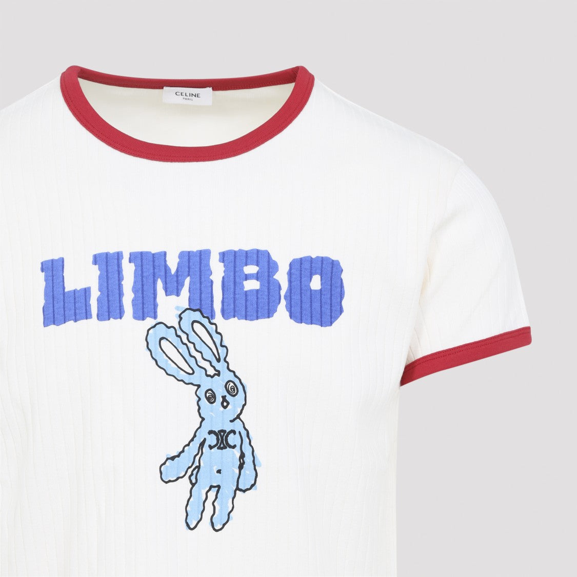 Iconic Celine Regular T-shirt crafted from premium ribbed cotton, offering an inviting white base that complements the striking red ribbed collar and cuffs. The front features an imaginative graphic print of a blue cartoon rabbit, making it a playful addition to any casual ensemble.