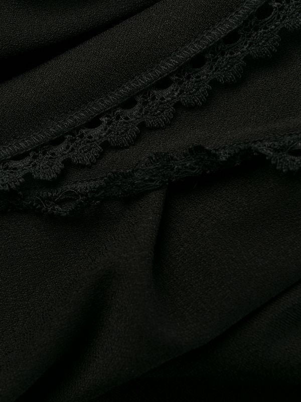 Chloé offers a striking midi dress that features a deep V-neckline and voluminous, ruched long sleeves with delicate lace trim. A flattering cinched waist with a drawstring tie enhances the silhouette, made from soft, flowing textile fabric that drapes beautifully.