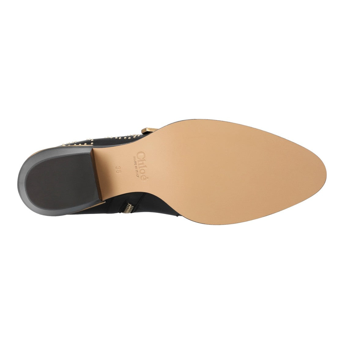 A striking pair of ankle boots made from nappa sheepskin and multi-layered calf leather. The pointed toe and low stacked heel are enhanced by decorative studs and multiple buckle straps for a bold look. Luxurious calf leather lining and sole provide comfort, while the side zipper allows for easy wear.