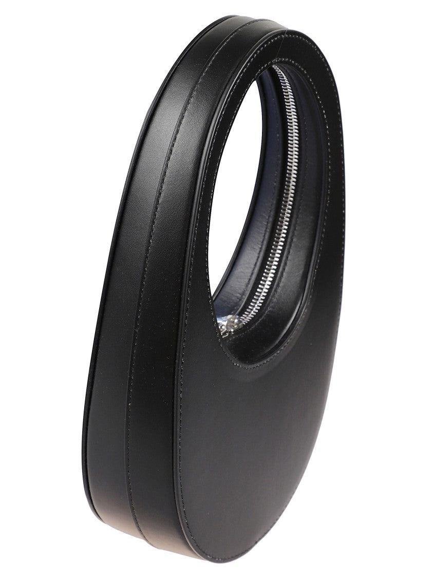The Coperni Swipe mini bag showcases modern minimalism through its unique curved shape made from smooth black leather. This chic accessory includes a circular handle and a secure zip closure, merging functionality with style. Subtle stitching adds to its refined look, making it a perfect match for any elegant outfit.